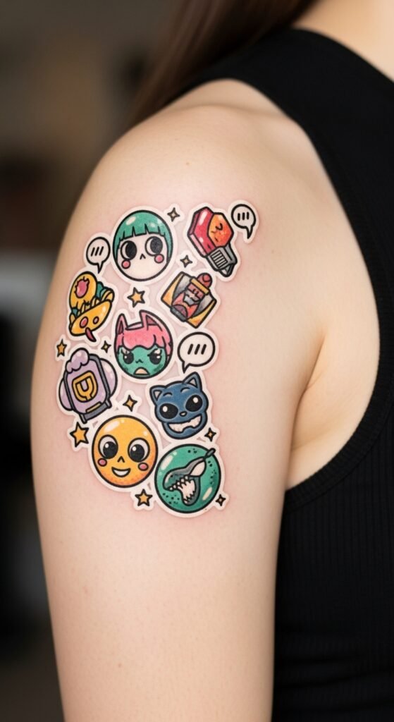 This concept channels playful nostalgia through a compact, sticker-like tattoo: a collage of small, bold-outlined pop culture icons in a semi-circle, rendered in vibrant, slightly saturated colors with glossy highlights and subtle halftone shading; add tiny stars and speech-bubble accents, size about 3–4 inches, ideal for forearm, shoulder blade, or calf. Symbolically it celebrates personal identity shaped by shared culture, evoking warmth, joy, and confidence; placement on a visible limb amplifies storytelling and invites connection, while shoulder blade or calf offers a more intimate, nostalgic keepsake.