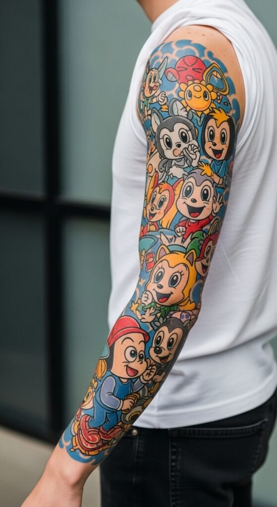 When you immerse yourself in the world of playful cartoon sleeve collections, you’ll discover a vibrant explosion of color and personality that can transform your skin into a canvas of nostalgia and joy.