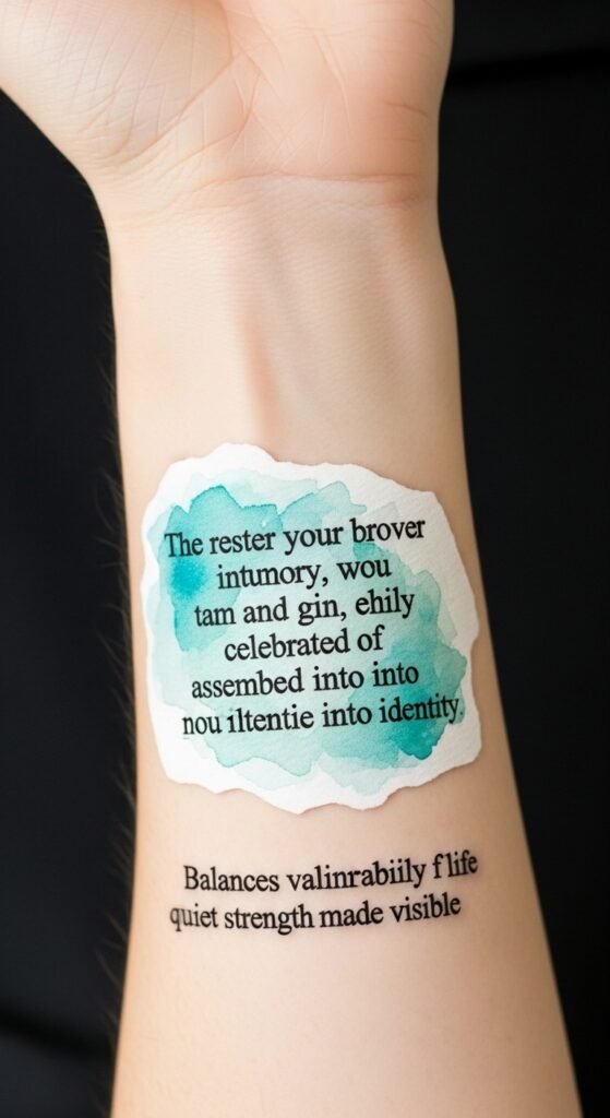 Emotionally it balances vulnerability and celebration—quiet strength made visible. Recommended placement is the inner wrist or along the forearm where the text can be read easily and revisited, creating an intimate connection between wearer and story.