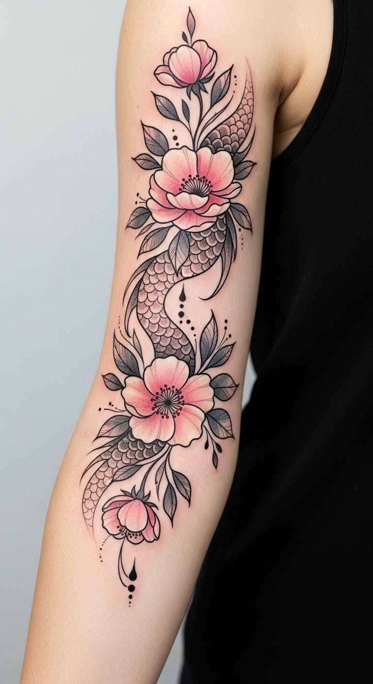 Choose a floral tattoo, and embrace elegance that transcends time. The design blends symbols of resilience and transformation—the flowers representing growth, love, and fleeting beauty, while the subtle dragon-scale texture adds strength and mystery; emotionally it evokes graceful confidence and gentle rebellion.