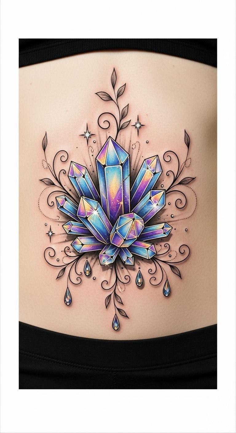 Emotionally it aims to evoke confidence, celebration, and a joyful desire to stand out. Placement is centered over the navel, following natural curves of the abdomen so the cluster sits as a focal point, with vines and gems trailing toward the hips for balance and movement.