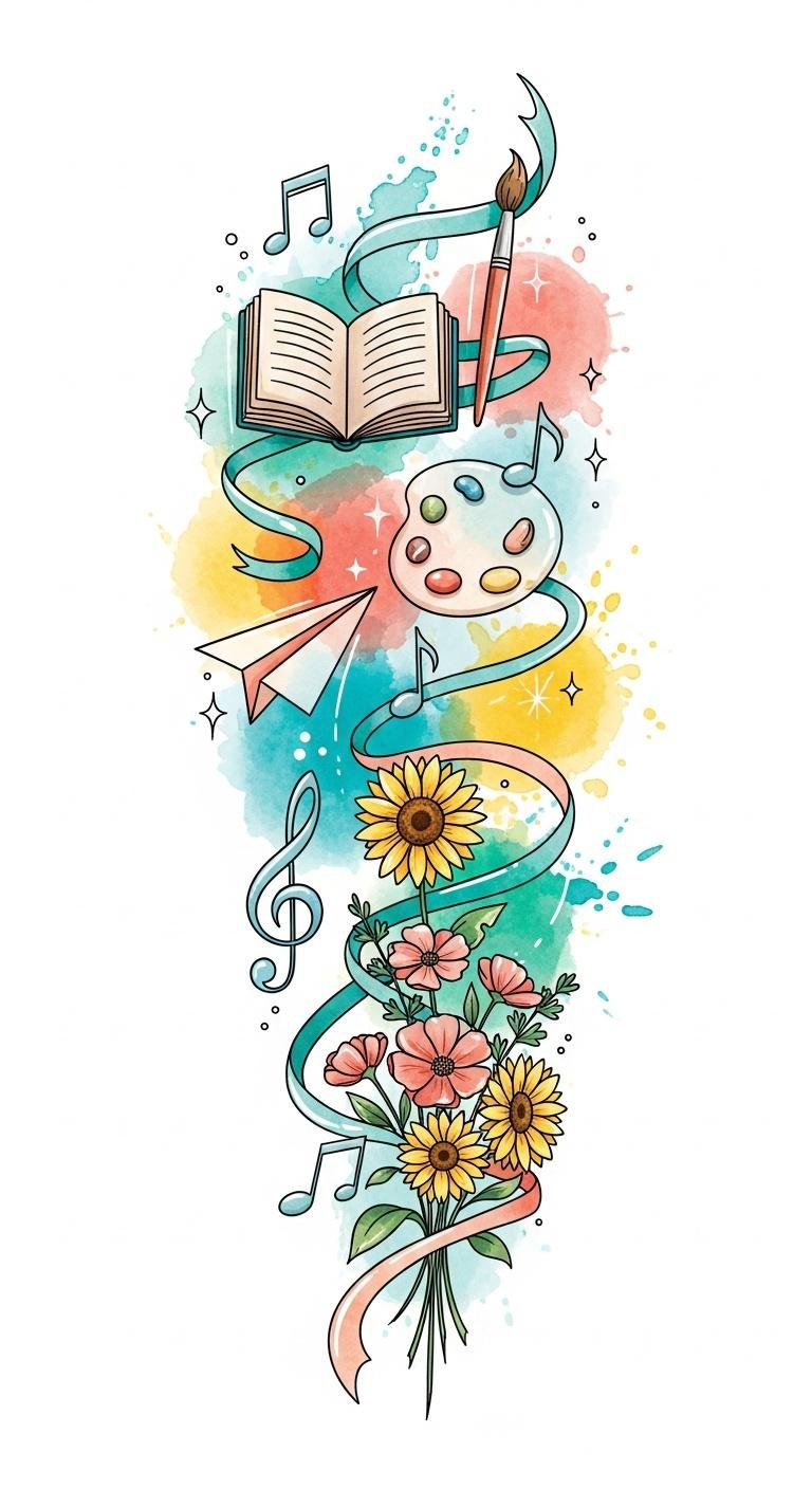 The composition symbolizes personal storytelling and creative freedom: the book and paintbrush represent imagination and craft, musical notes and paper airplane suggest joyful expression and exploration, while wildflowers convey growth and individuality.