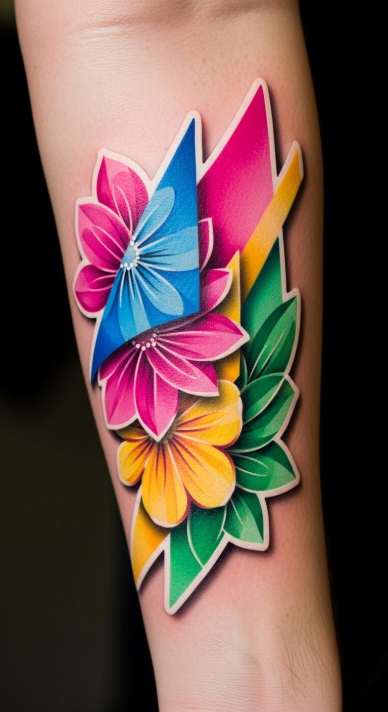 Vibrant hues and glossy highlights convey joy and confidence, the bold outlines ensure longevity and readability over time, and the forearm placement offers visibility for self-expression yet can be covered if desired, inviting both dialogue and private meaning.