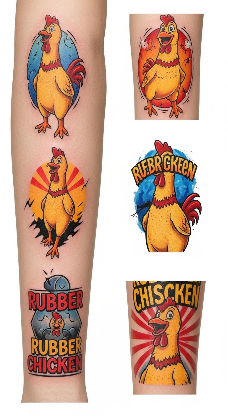 This design uses the rubber chicken as a symbol of lightheartedness and irreverence, meant to evoke spontaneous laughter and uplift the wearer’s mood; bright colors and exaggerated, cartoon lines emphasize joy and playfulness, making it ideal for visible, casual placements like the forearm, calf, or shoulder where it can be easily shown off and spark conversations.