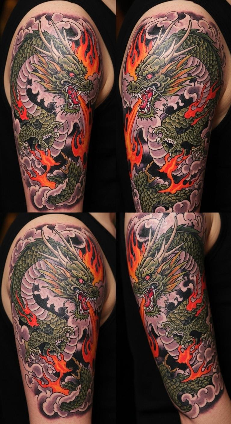 This design channels the original lines into a vivid sleeve or back-piece: a large, sinuous dragon rendered in bold, saturated colors—crimson, emerald, sapphire—its scales catching light with subtle metallic highlights, breath forming stylized flames and cloud wisps that wrap around limbs or shoulder blades. Symbolically it stands for inner strength, courage, and the daring to pursue freedom; emotionally it reads as empowering and audacious, projecting confidence. Ideal placement options are a full arm sleeve, chest-to-shoulder flow, or a dramatic back piece where the composition can move with muscle and posture.