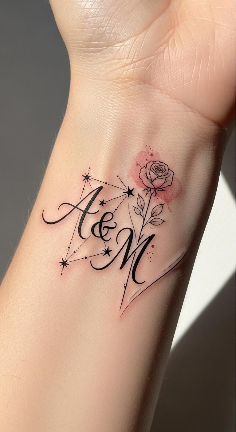 The intertwined initials symbolize unity and personal history, the stars evoke aspiration and guidance, and the rose adds tenderness and love; placed on the wrist or collarbone the design reads as an intimate, wearable emblem that can be shown or concealed depending on mood, eliciting warmth, confidence, and a quiet sense of belonging.
