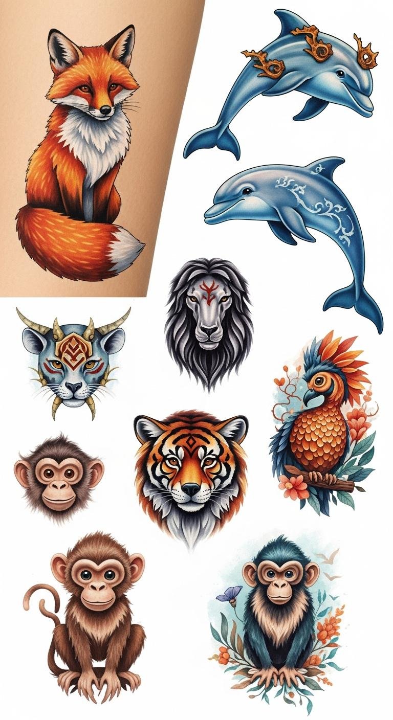 A cluster of small, colorful animal motifs — a stylized fox with a curled tail, a leaping dolphin outlined in teal and silver, and a mischievous monkey mid-swing — arranged for a forearm wrap or shoulder scatter; bold clean lines with watercolor fills, tiny stars and leaves as connectors; ideal size 2–4 inches each, playful yet elegant, wearable as temporary or permanent ink. Symbolically, the fox conveys cleverness and adaptability, the dolphin represents joy and harmony, and the monkey brings curiosity and spontaneity; together they evoke lighthearted freedom and sociable energy, suited to visible placements where they can spark smiles and conversation.