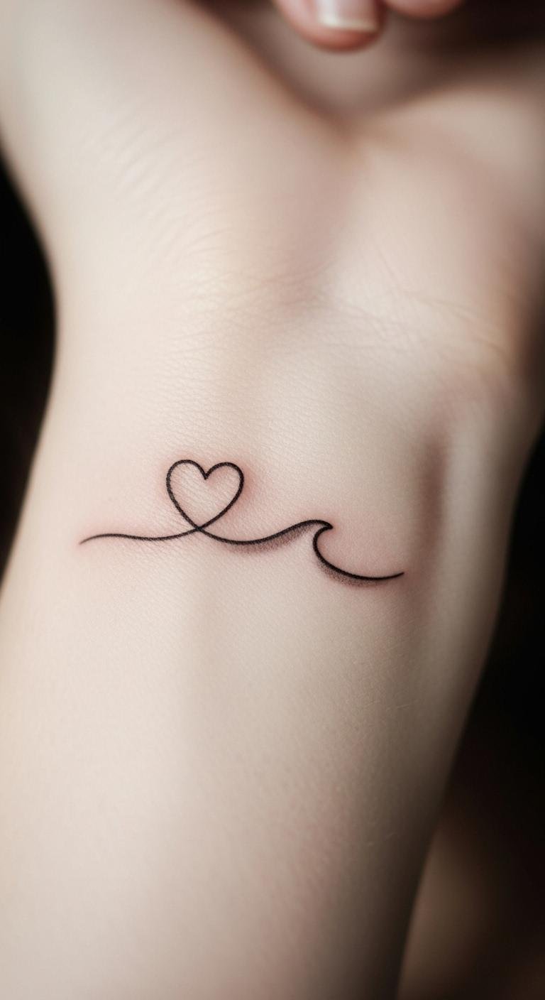 This design pairs a tiny heart and a flowing wave to symbolize tender emotion and quiet movement — a personal reminder of love that adapts and endures; its fine lines and small scale keep the sentiment intimate, best placed where glimpses can be shared (collarbone or inner wrist) to evoke gentle connection and calm.