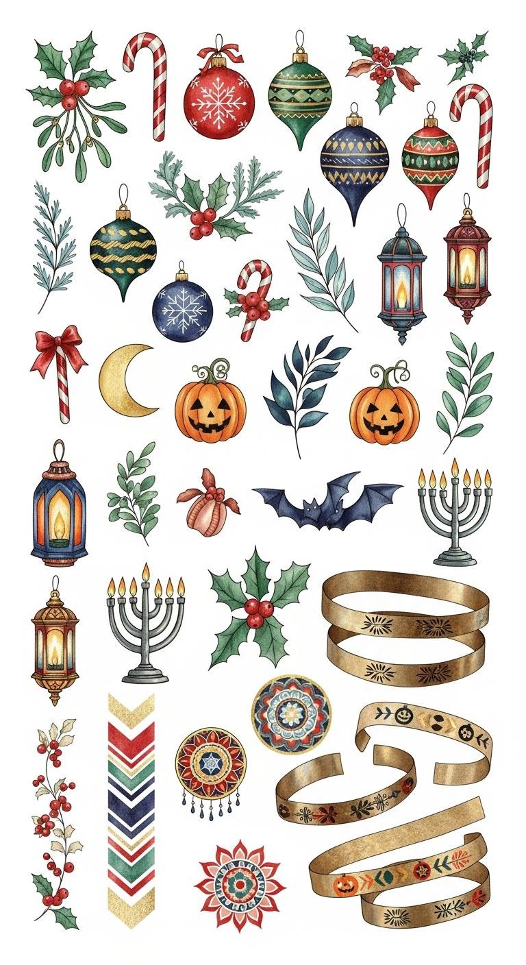 The dual Christmas and Halloween elements allow for cross-seasonal expression, while lanterns, menorah, and rangoli motifs honor diverse traditions, promoting inclusivity.