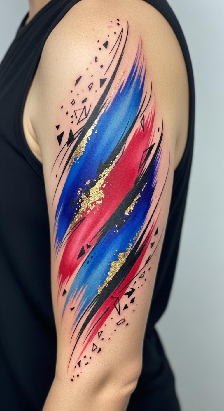 Creativity flows freely through the vibrant world of abstract art tattoos, where every design invites personal interpretation and expression. Embrace abstract expressionism to celebrate your artistic freedom, using color symbolism to convey personal narratives. These tattoos inspire creative experimentation, allowing you to wear your imagination boldly. Each piece becomes a unique story, reflecting your journey and passion for individuality. The placement across the shoulder blade flowing toward the wrist symbolizes an unfolding personal narrative and outward movement; cobalt blue suggests introspection, crimson evokes passion and resilience, and gold leaf accents denote precious milestones. Thin gestural lines convey spontaneous emotion while geometric fragments anchor moments of clarity, creating a balance between chaos and control that resonates emotionally and visually with the wearer.