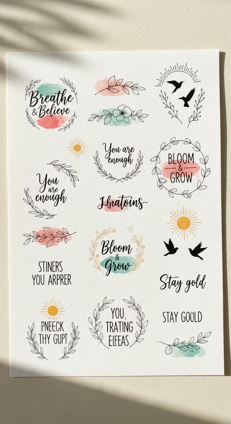 This design pairs tender handwriting and typewriter fonts with nature symbols to evoke resilience (birds, suns) and steady growth (botanical lines), while pastel watercolor hints add calm optimism; ideal placements are the inner wrist or forearm where the wearer can glance often, creating a private ritual of encouragement and reinforcing feelings of empowerment, authenticity, and gentle determination.