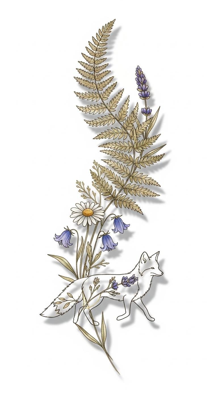This design symbolizes harmony between wildlife and plant life, evoking calm, curiosity, and a gentle adventurous spirit; the winding fern suggests growth and resilience, the wildflowers convey beauty and transience, and the fox adds playful intelligence—together they celebrate environmental themes and a personal connection to the outdoors.