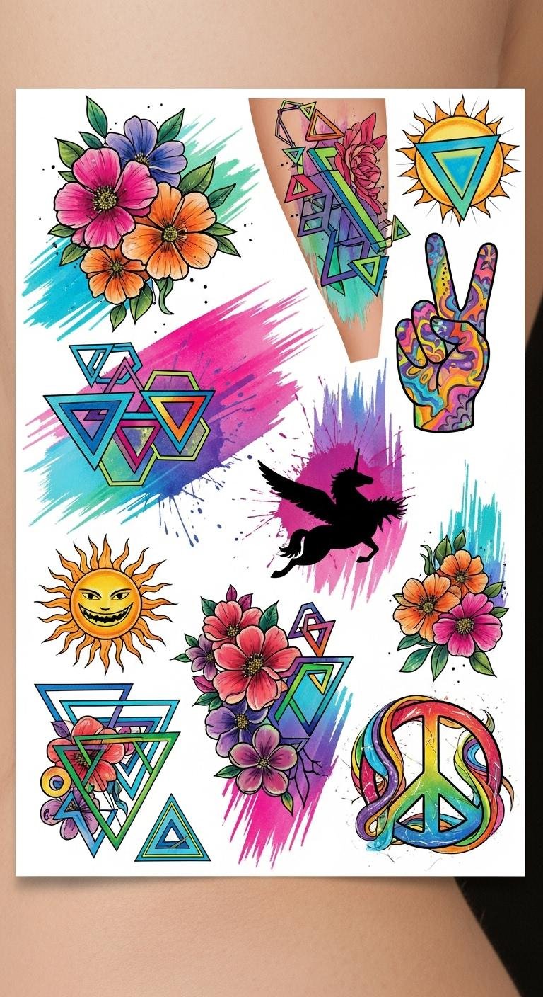 The design blends energetic visuals—floral vitality for growth, neon geometry for modern confidence, and watercolor splashes for creative spontaneity—evoking joy and daring; ideal placements include the forearm for visibility and narrative flow, the shoulder for a statement accent, and the ankle for subtle, flirtatious detail.
