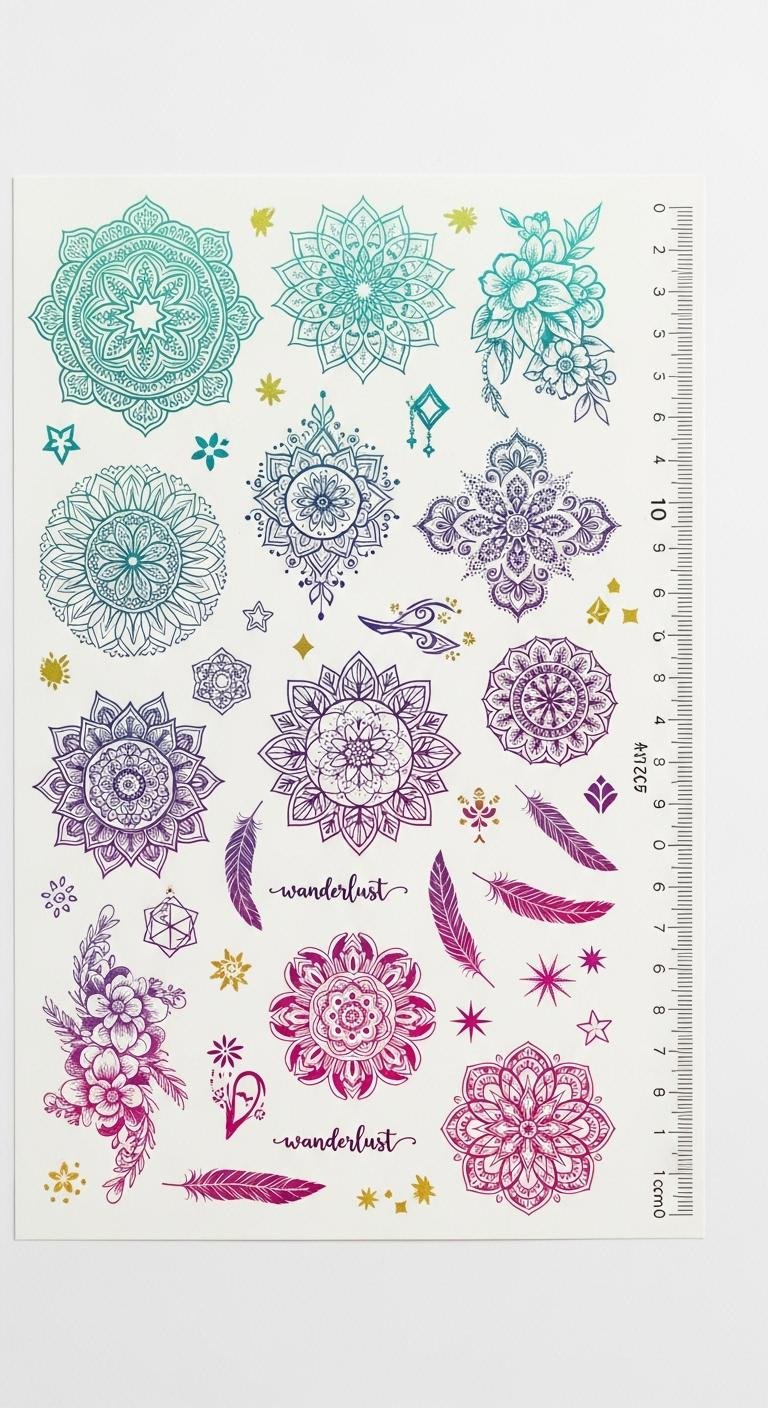 Placement suggestions: wrist or forearm for small icons and script, shoulder blade or upper arm for mandalas, and ankle or behind-ear for delicate feathers or stars, allowing layered mixes to tell a personal visual story.