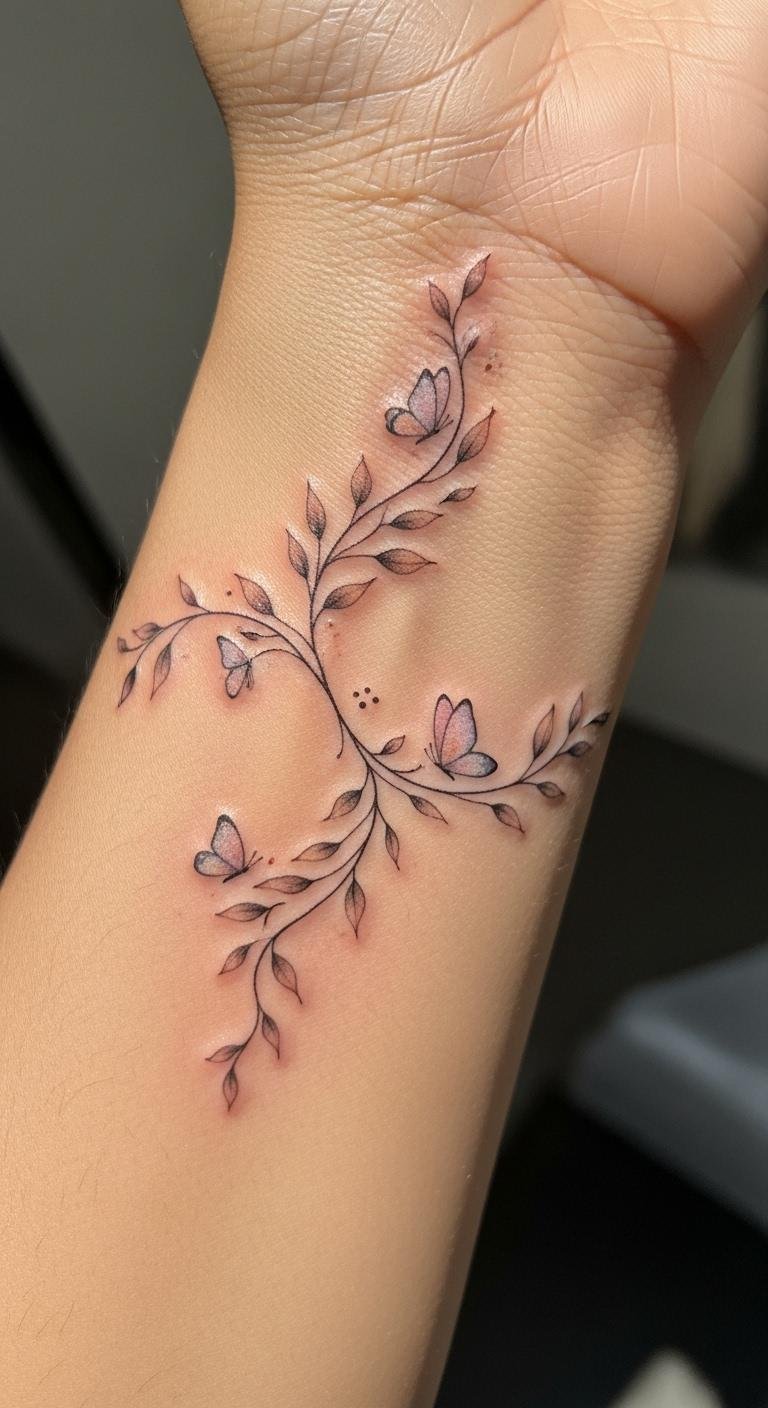 The intertwining vines symbolize growth and resilience, the butterflies represent transformation and fleeting beauty; together they evoke a gentle, hopeful emotion suited to personal renewal.