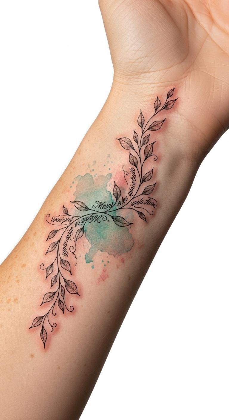 The design symbolizes transience and self-discovery: the vines represent growth and change, the miniature script captures a fleeting personal mantra, and the watercolor washes convey emotion and impermanence.