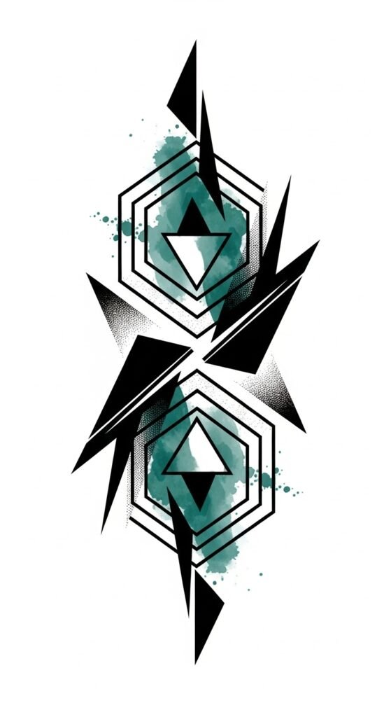 This design symbolizes balance (the mirrored axis) and growth (interlocking hexagons), with shards suggesting movement and the teal wash evoking emotional depth; it elicits confidence and calm, ideal for a forearm wrap to read in motion or centered on the upper back as a bold statement piece.