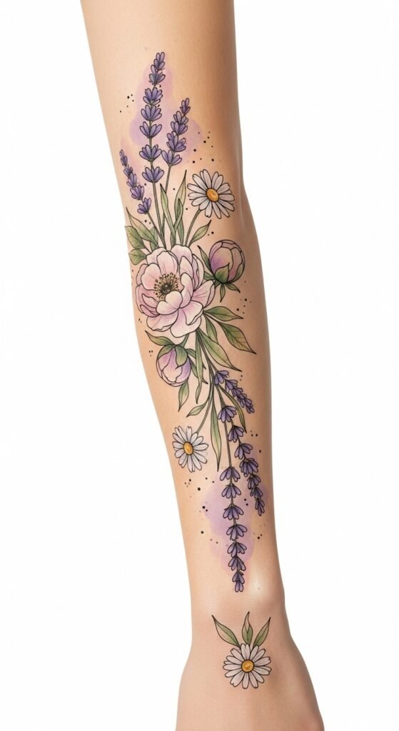 Each bloom symbolizes facets of a free spirit: lavender for tranquility, daisies for innocence and joy, and peony buds for graceful beauty and growth; the gentle watercolor hues evoke a serene emotional palette while the fine lines suggest fragility and elegance.