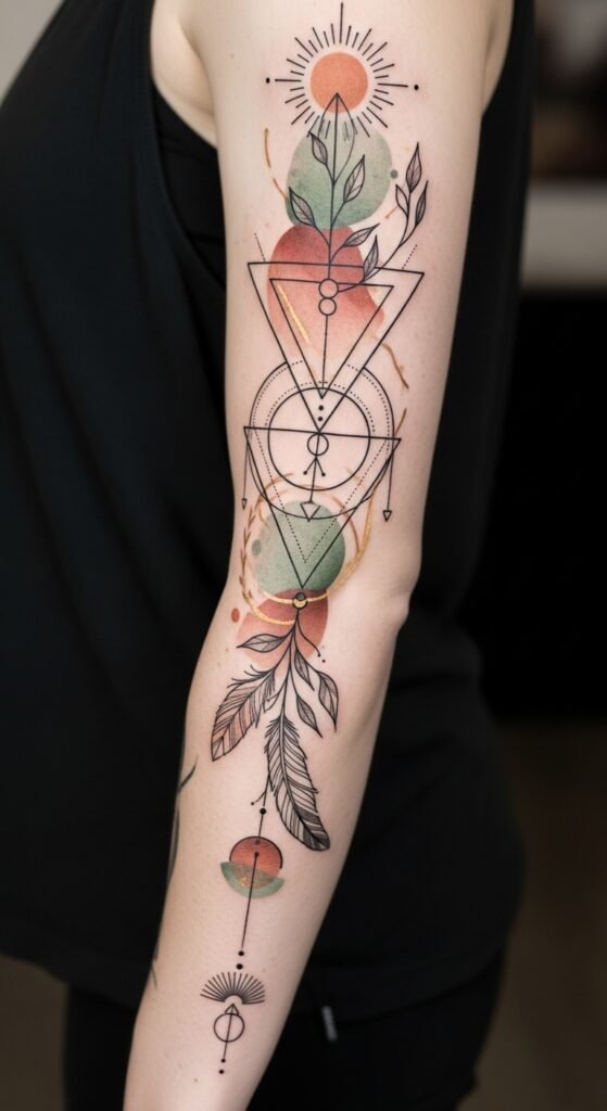 The design symbolizes balance between order and wildness—sharp geometric anchors blend with organic elements like feathers and vines to evoke wanderlust and inner calm; emotionally it feels liberating yet grounded, ideal on the forearm or shoulder where movement and visibility amplify its storytelling, or along the ribcage for a private, intimate expression.