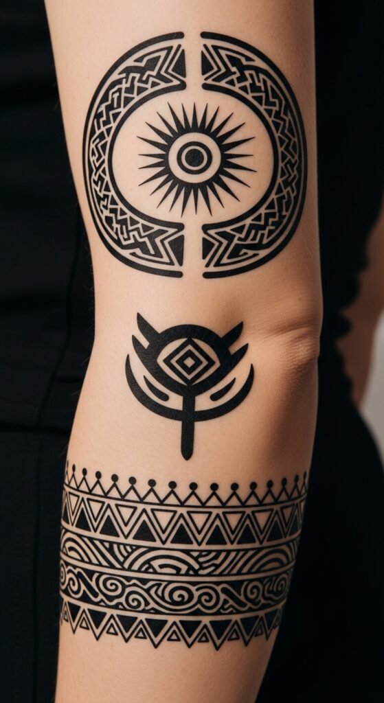 A flowing half-sleeve design blending bold black tribal lines with interwoven patterns inspired by ocean waves, sun motifs, and ancestral markings; use varying line weights for contrast, negative space to form a central spiral representing continuity, and subtle dotwork accents to suggest texture. The symbolism evokes connection to lineage, cultural pride, and personal freedom, while the visual rhythm expresses strength and fluid motion; place along the upper arm wrapping toward the shoulder for visibility and a sense of protective embrace.