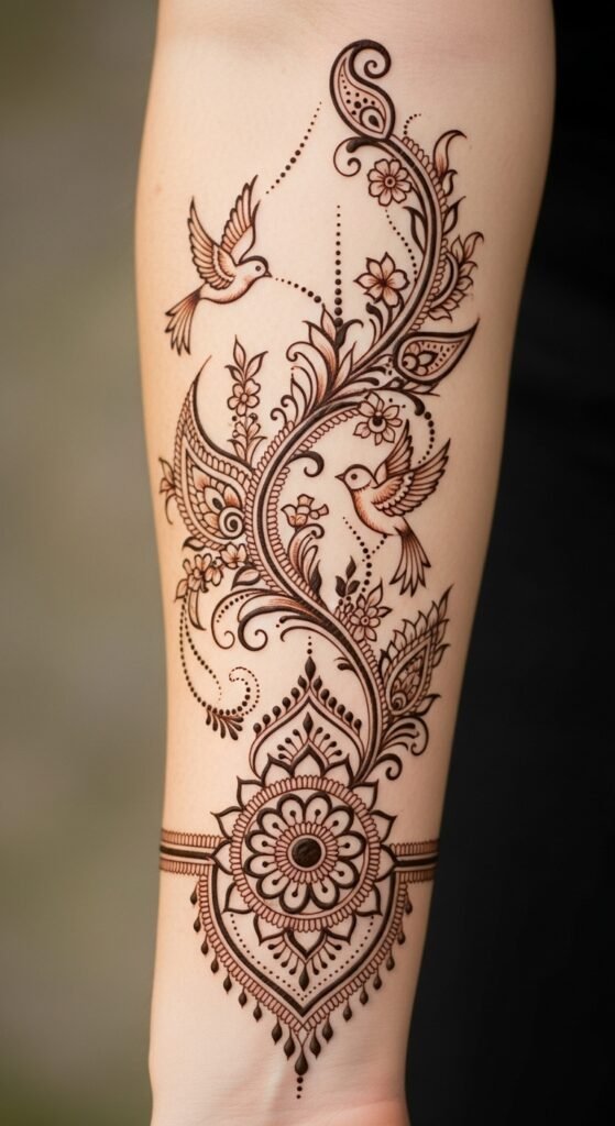 This forearm placement lets the mandala center represent inner balance, paisley vines and blossoms signify growth and renewal, and the small birds embody freedom; delicate dotwork and negative space create a gentle, intimate emotion while the wrap-around composition allows visible movement and connection with wrist and elbow.