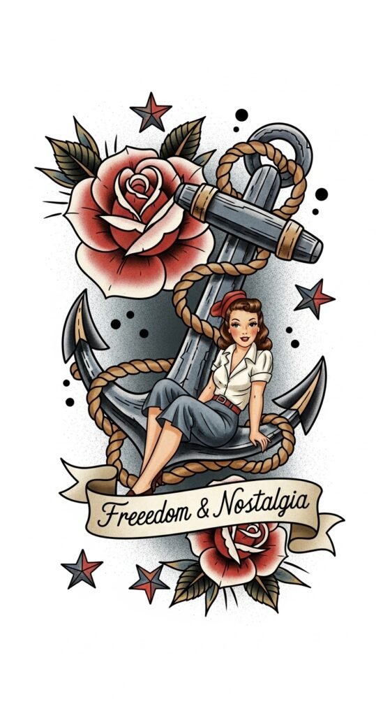 This design concept blends the enduring symbols from the original text—rose, anchor, and pin-up girl—into a cohesive vintage flash piece that celebrates individuality, freedom, and nostalgia.