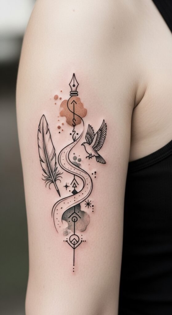 The quill represents voice and memory, the winding path signifies life’s journey and growth, the cultural sigils anchor personal heritage, and the rising bird conveys liberation; together they evoke resilience and introspective pride—ideal on the inner forearm for daily reminder or upper back for a more private, ceremonial placement.