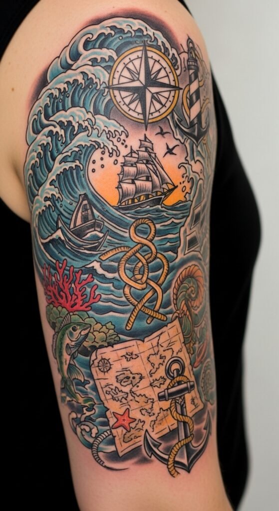 This design concept weaves together the listed motifs into a cohesive sleeve or back piece: a central compass rose over subtle watercolor waves, flanked by a bold anchor entwined with sailor knots and a silhouetted ship heading toward a distant lighthouse; marine life like a swirling school of fish, a detailed octopus, and coral textures fill negative spaces, while a faded treasure map ribbon wraps around the composition. Symbolically it balances guidance (compass, lighthouse), stability (anchor, knots), and curiosity (ship, map), evoking nostalgia, wanderlust, and resilience; ideal placement is a forearm sleeve, full upper arm, or center-back canvas where flow and movement can follow muscle contours.