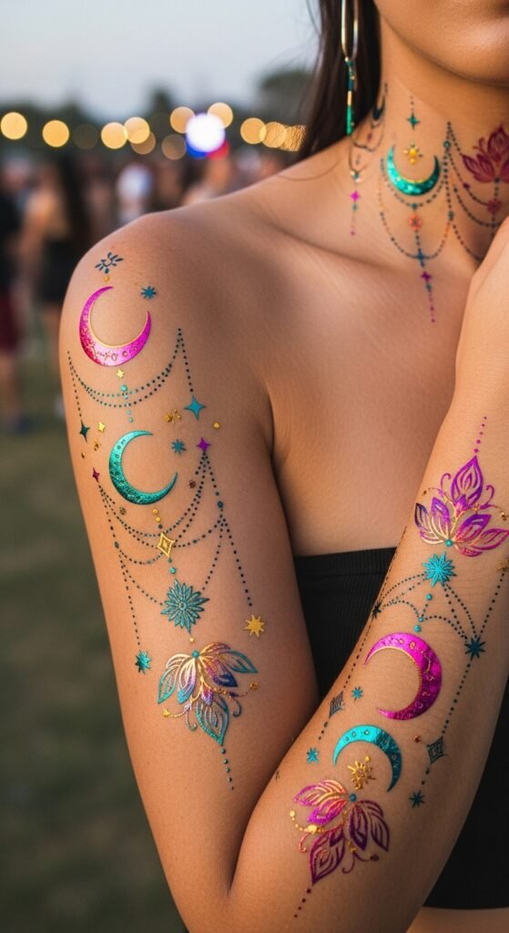 Ideal placements include the shoulder for bold display while dancing, the forearm for visible interaction, and the collarbone for a subtle, elegant shimmer that catches festival lights.
