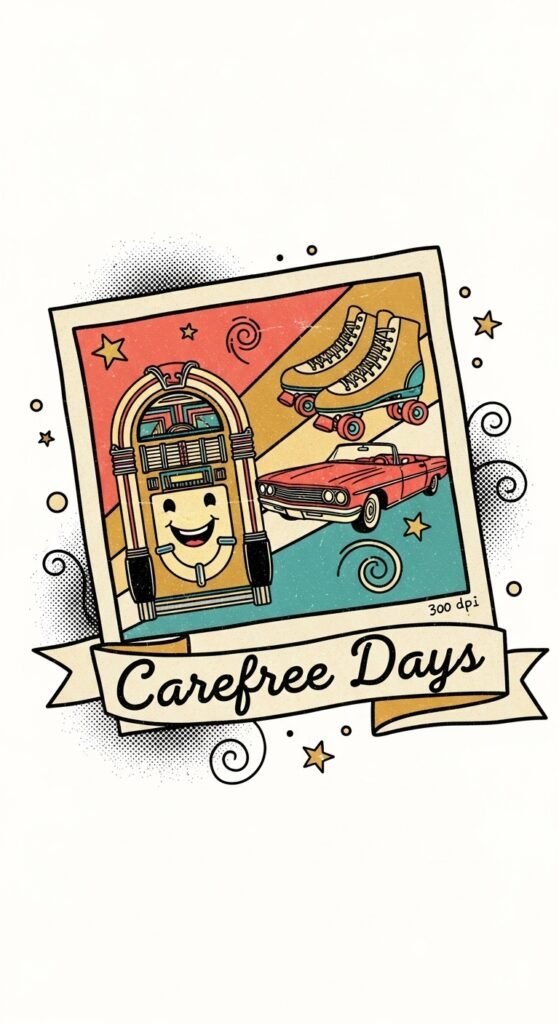 The design blends iconic retro elements to symbolize memory, music, mobility, and youthful freedom; the Polaroid frame represents captured moments, the jukebox evokes soundtracks of the past, the convertible and roller skates signify movement and carefree exploration, while the banner ties the theme together—placement on the wrist or forearm keeps these reminders personal and visible, upper arm allows a bolder statement.