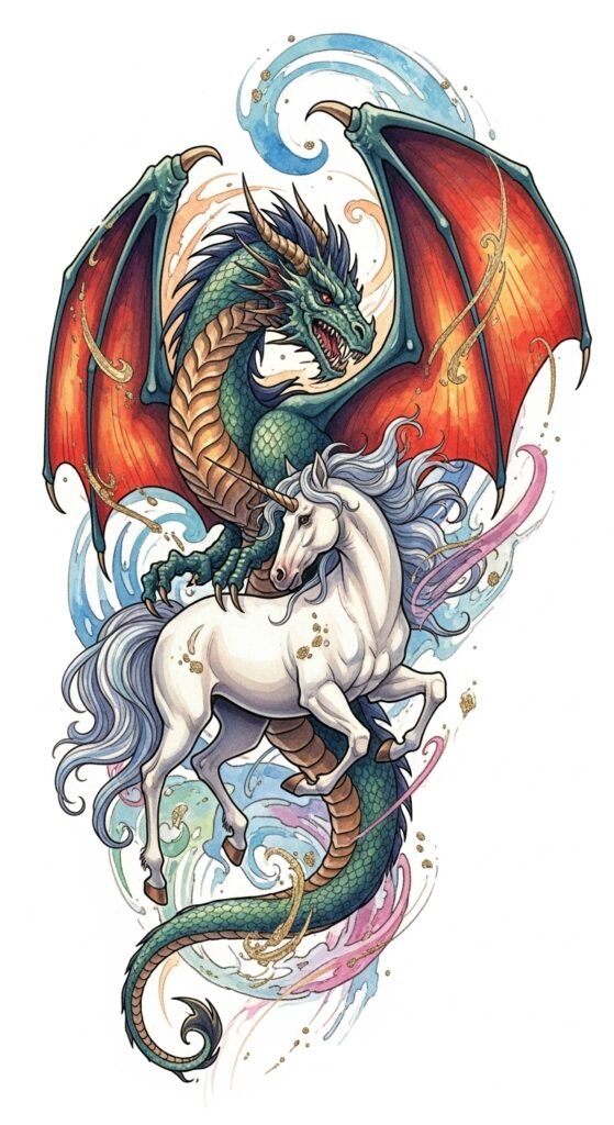 This design symbolizes the balance of strength and purity—the dragon’s fire and the unicorn’s grace—evoking courage, wonder, and personal transformation; emotionally it feels bold yet tender, perfect for the forearm or shoulder where motion accentuates the intertwined forms and allows for visibility and personal meaning.