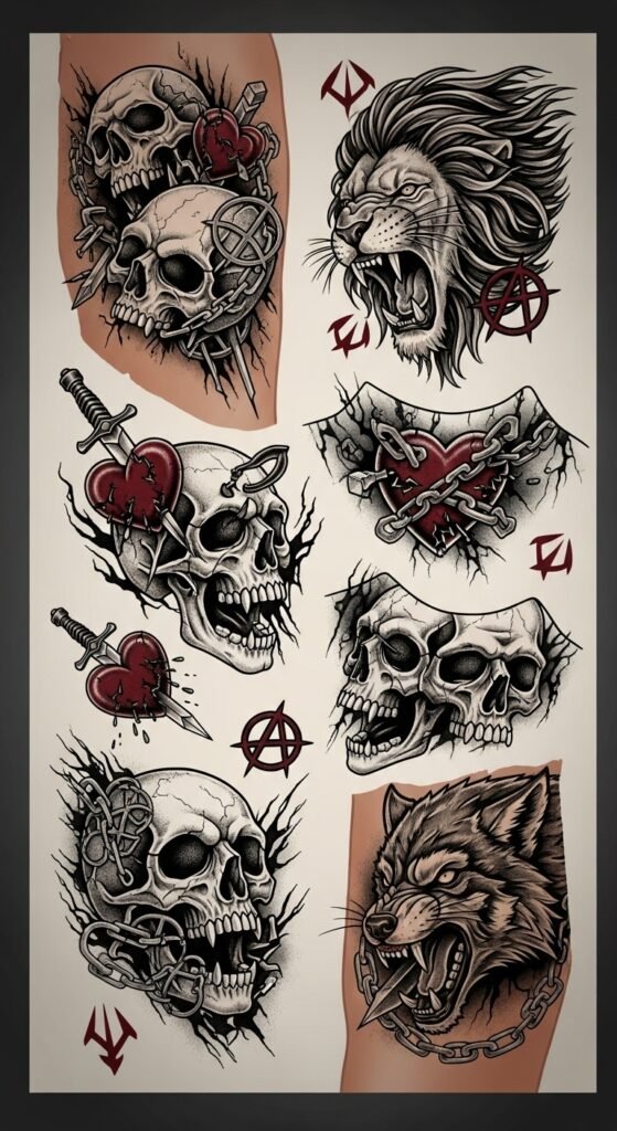 Embrace the freedom to wear your attitude and let your creativity shine brightly! The symbolism blends mortality (skulls), resistance (daggers, broken chains, anarchy sigils), and primal strength (lion, wolf) to evoke defiance and empowerment; emotionally the set inspires courage, rebellion, and raw confidence; ideal placements are forearm strips for visibility and statement, shoulder blade for larger compositions that move with the body, and collarbone for a subtle yet provocative accent.