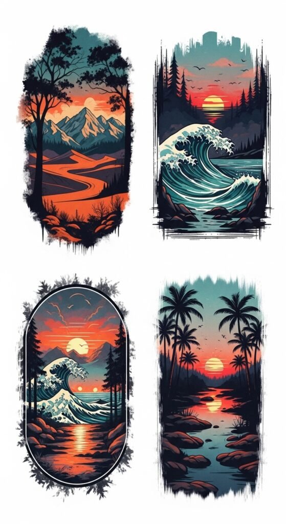 This design concept layers a panoramic mountain range at the center, flanked by silhouetted trees and small wildlife figures—a fox and a bird—interacting with flowing river reflections and a distant sun setting behind dunes; fine-line detailing and soft watercolor washes of teal, amber, and mauve enhance calm and wanderlust, evoking freedom, resilience, and connection to the wild.