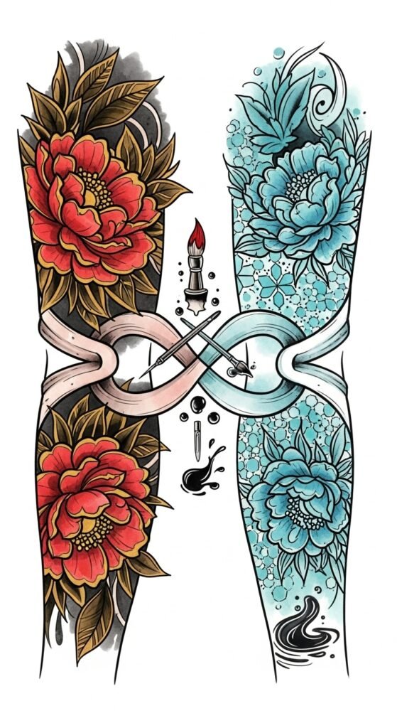 Emotionally it evokes mutual respect, playful experimentation, and the joy of creative exchange. Ideal placement is the outer forearm or the shoulder blade where the curved surface allows the interlocking halves to read as a unified statement when viewed from different angles; sizing at roughly 4×6 inches preserves detail while remaining wearable as a temporary expression of personal style.