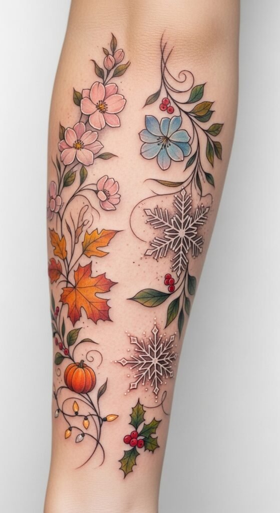 With each tattoo, you celebrate the rhythm of life, showcasing your unique spirit and style. This design symbolizes cyclical renewal and personal growth, evoking warmth in autumnal hues, joy in spring blossoms, and serene reflection with winter details; it suits a forearm sleeve or calf placement where the flow of vines can wrap naturally, allowing the wearer to display changing moods and memories across a visible, intimate canvas.