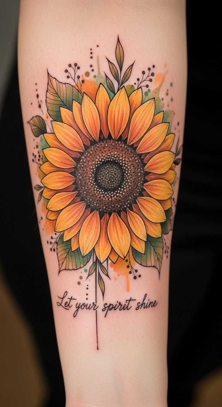 Whether you choose a small, delicate piece or a bold statement, each tattoo reminds you to embrace life’s beauty, spreading light wherever you go. Let your spirit shine! The design symbolizes resilience, optimism, and personal growth—the large central bloom represents the self, surrounded by leaves that suggest support and community; watercolor accents convey fleeting moments of joy.