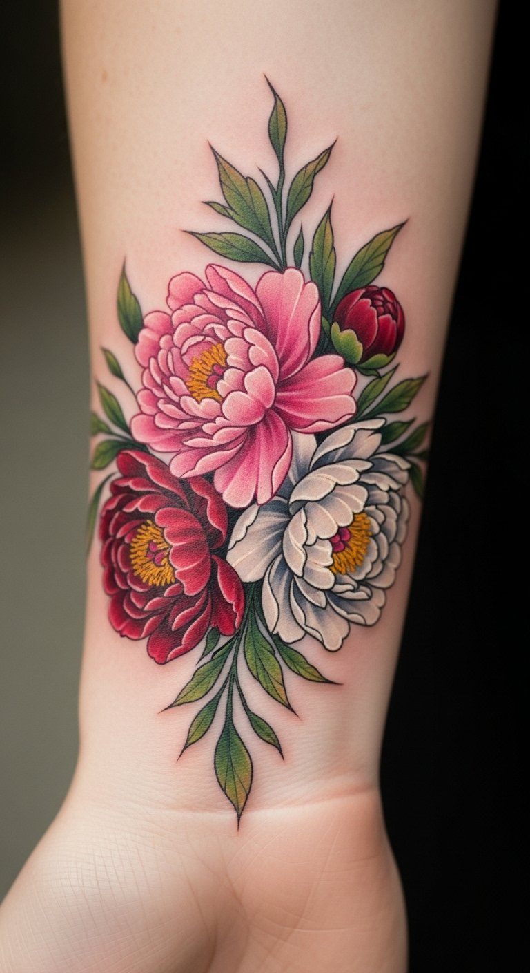Peony tattoos carry layered symbolism—prosperity, romantic tenderness, fiery passion, and serene purity—evoking emotions from joyful warmth to quiet reverence depending on color and composition;