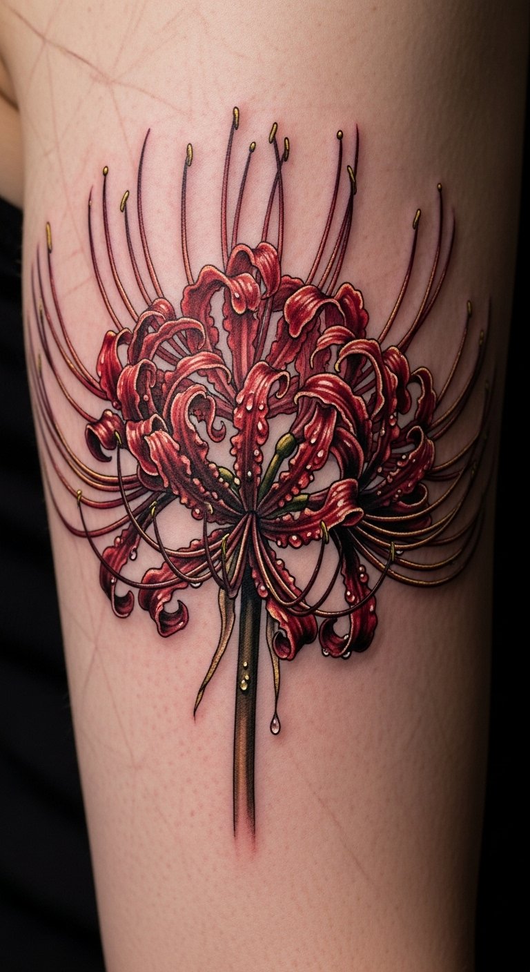 This concept channels those themes into a design that balances fragility and strength: the spider-lily petals suggest motion and rebirth while the web-like filigree speaks to connection and endurance, evoking intense emotion and personal narrative; placement on the upper arm or ribs allows for intimate display or concealment, contouring the body to enhance the tattoo’s flow and meaning.