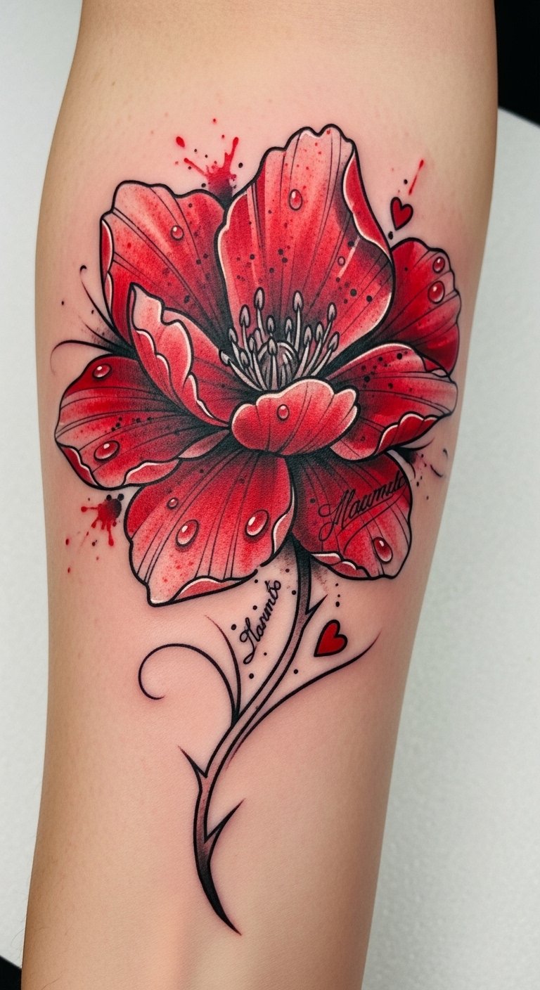 Red flower tattoos radiate love and passion, capturing the heart’s most profound emotions in vibrant ink. Each petal symbolizes desire, strength, and romance, making them bold statements on your skin.