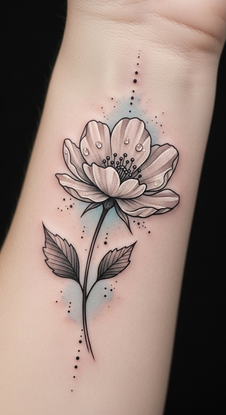 The design’s soft palette and minimal linework symbolize quiet resilience and renewal, evoking calm and introspection; ideal placements such as the clavicle or inner wrist allow personal visibility and gentle intimacy, while the ankle offers discreet, private expression.
