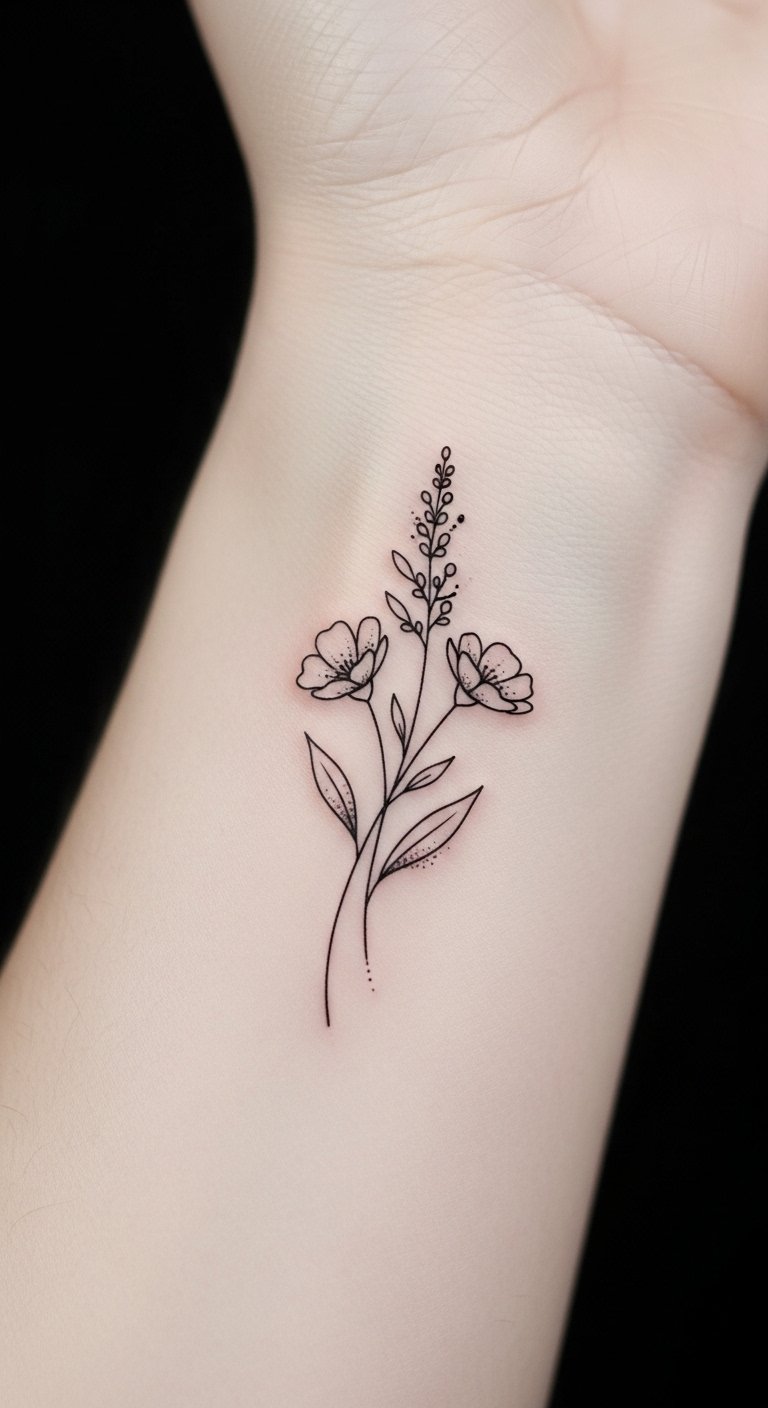 This design symbolizes simplicity, resilience, and quiet growth—an intimate reminder of personal evolution and tender moments. Placed on the wrist or ankle, it sits where it can be seen in small glimpses, evoking gentle emotion and serving as a private talisman; the fine lines and minimal shading keep the piece versatile for any style while allowing future additions if desired.