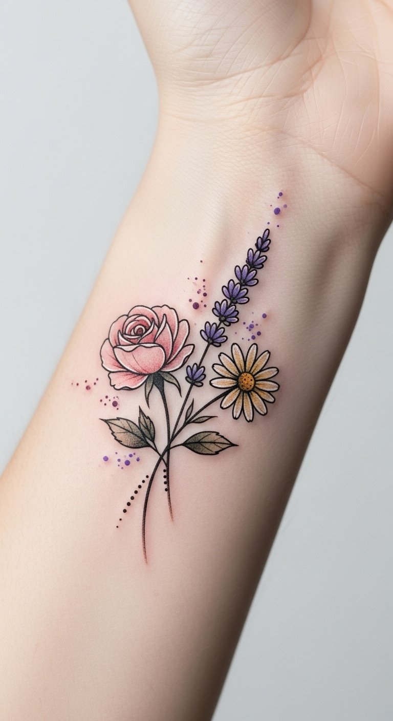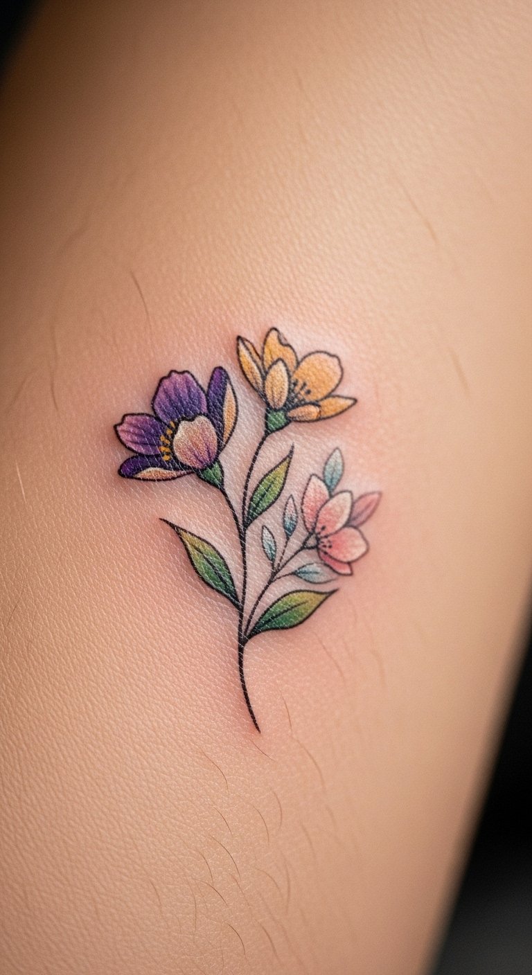 This tiny floral concept symbolizes the balance between vibrancy and calm—bold contrasts represent confidence and individuality while the pastel elements convey serenity and introspection; placement on the wrist or behind the ear allows for intimate visibility or subtle concealment, evoking personal freedom and quiet celebration of self-expression.