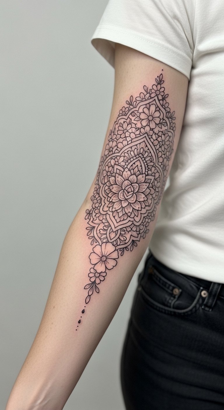 Tiny flowers juxtaposed with a larger, detailed motif symbolize the balance between fragility and strength, personal stories woven into a cohesive visual narrative; emotionally, the contrast conveys growth, resilience, and individuality—perfect for a forearm sleeve where the cascading tiny blooms can lead the eye into the bolder centerpiece, or along the ribcage/side to create movement that complements the body’s natural lines.