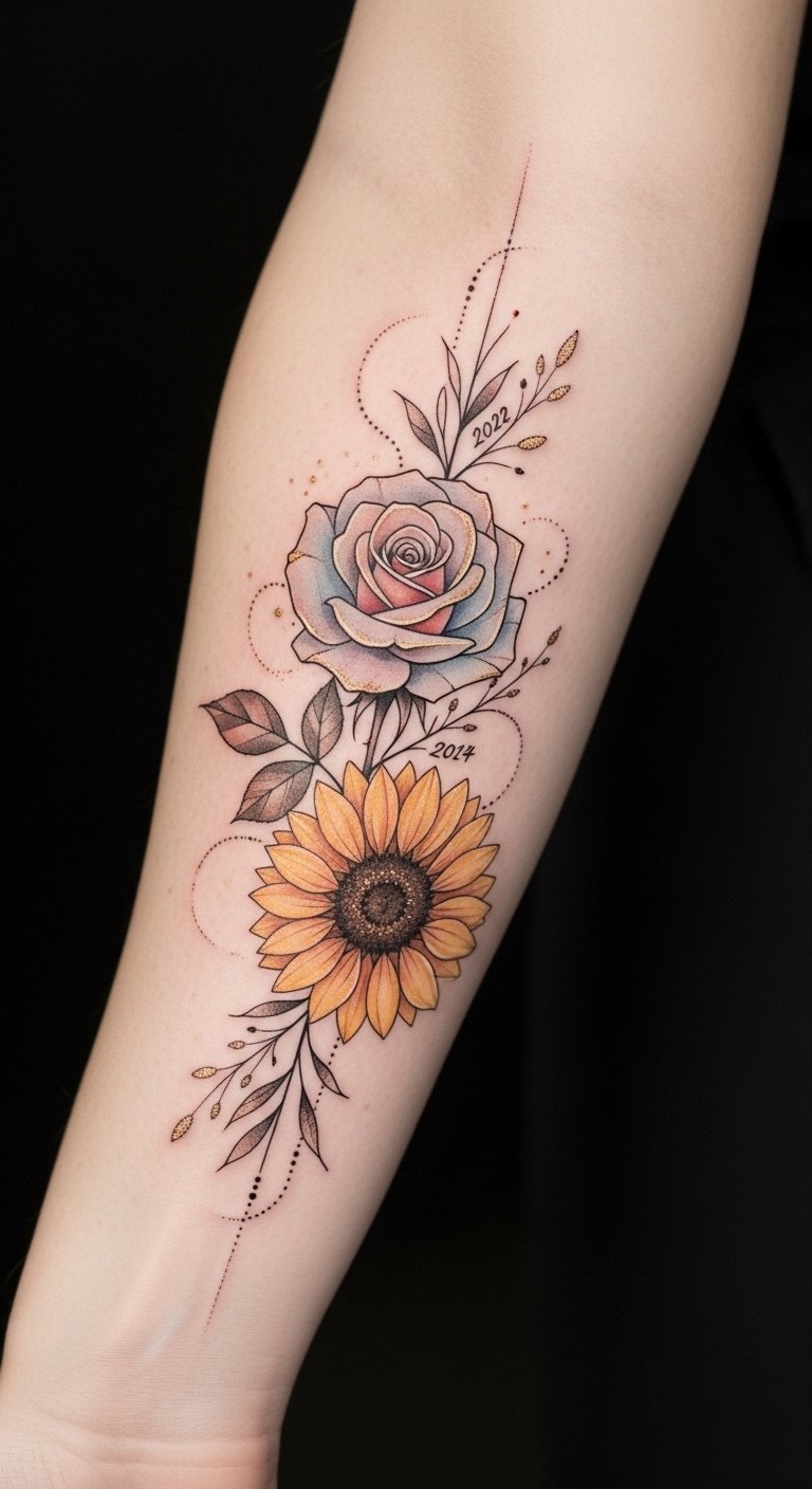 These tiny intertwined rose and sunflower elements symbolize the balance between timeless love and radiant optimism, capturing growth and personal journeys in a compact form; the fine-line detail and soft dotwork evoke tenderness and resilience, making the piece feel intimate and uplifting; ideal placement on the wrist or behind the ear allows for both private meaning and visible expression, illuminating individuality without overwhelming your style.