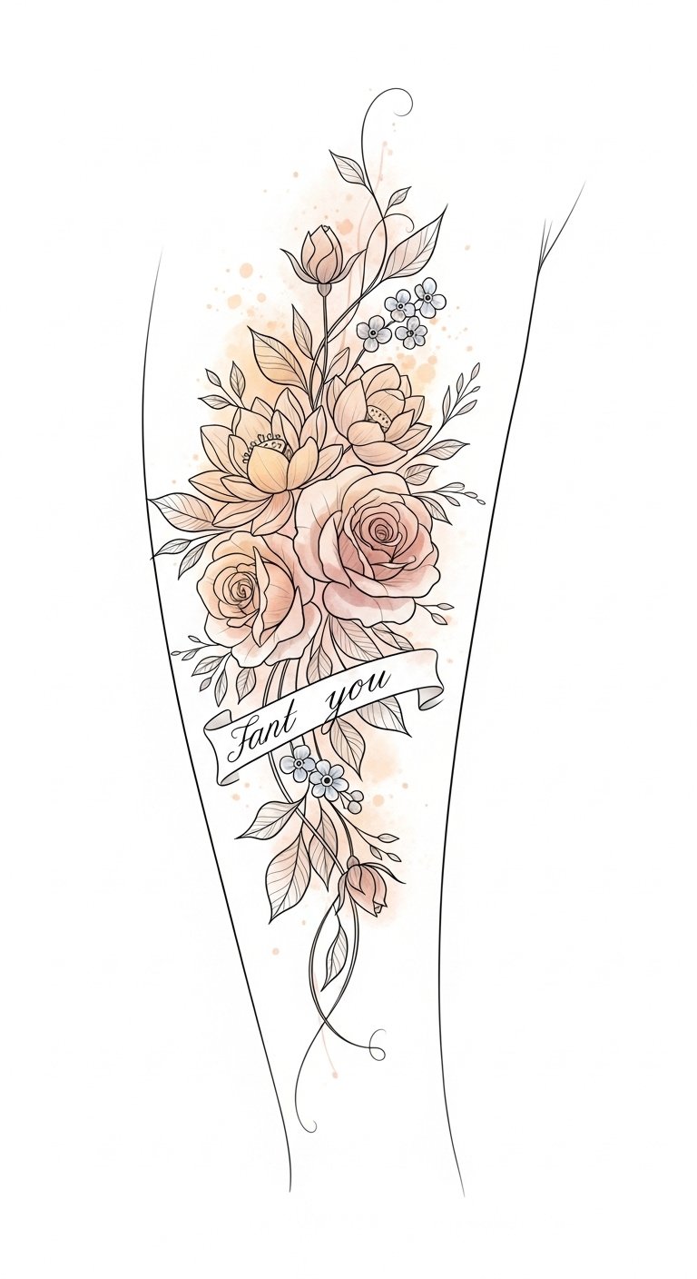Embrace this art form, letting your tattoos reveal your heart’s true essence and personal significance. Place along the inner forearm where the intertwining blooms can follow the natural curve of the arm, allowing glimpses of the hidden script to feel intimate and private while the watercolor hues convey softness and memory.