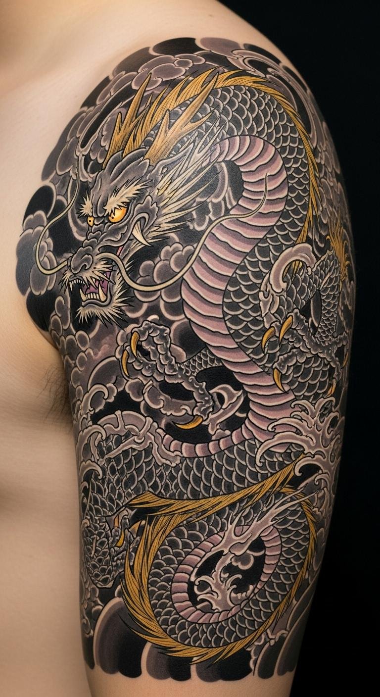 The design emphasizes protection and resilience—strong, grounding emotions—while the swirling clouds and wind suggest liberation and movement; ideal placement is a dynamic area like shoulder blade wrapping to ribs or full back where the S-curve can flow with the body’s contours, allowing the dragon’s gaze to anchor the piece and negative space to serve as breath and light.