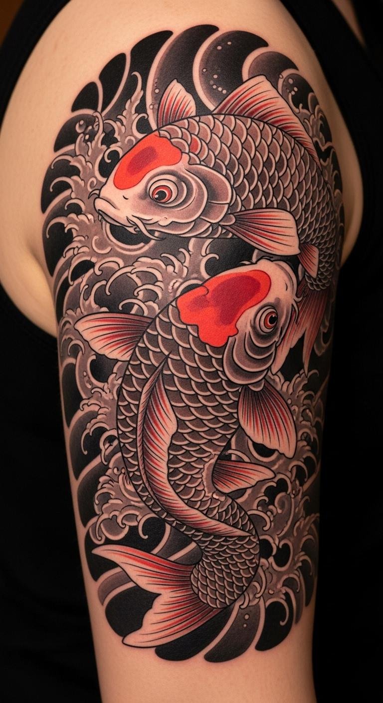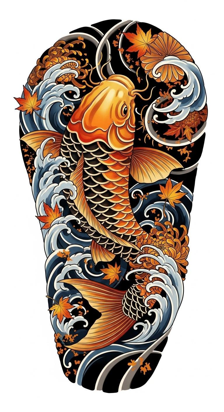 Koi fish gracefully maneuvering the waters remind you that movement and change are integral to life’s journey, much like the swirling clouds and gusts of wind in Japanese tattoo art.