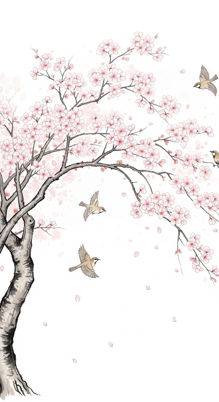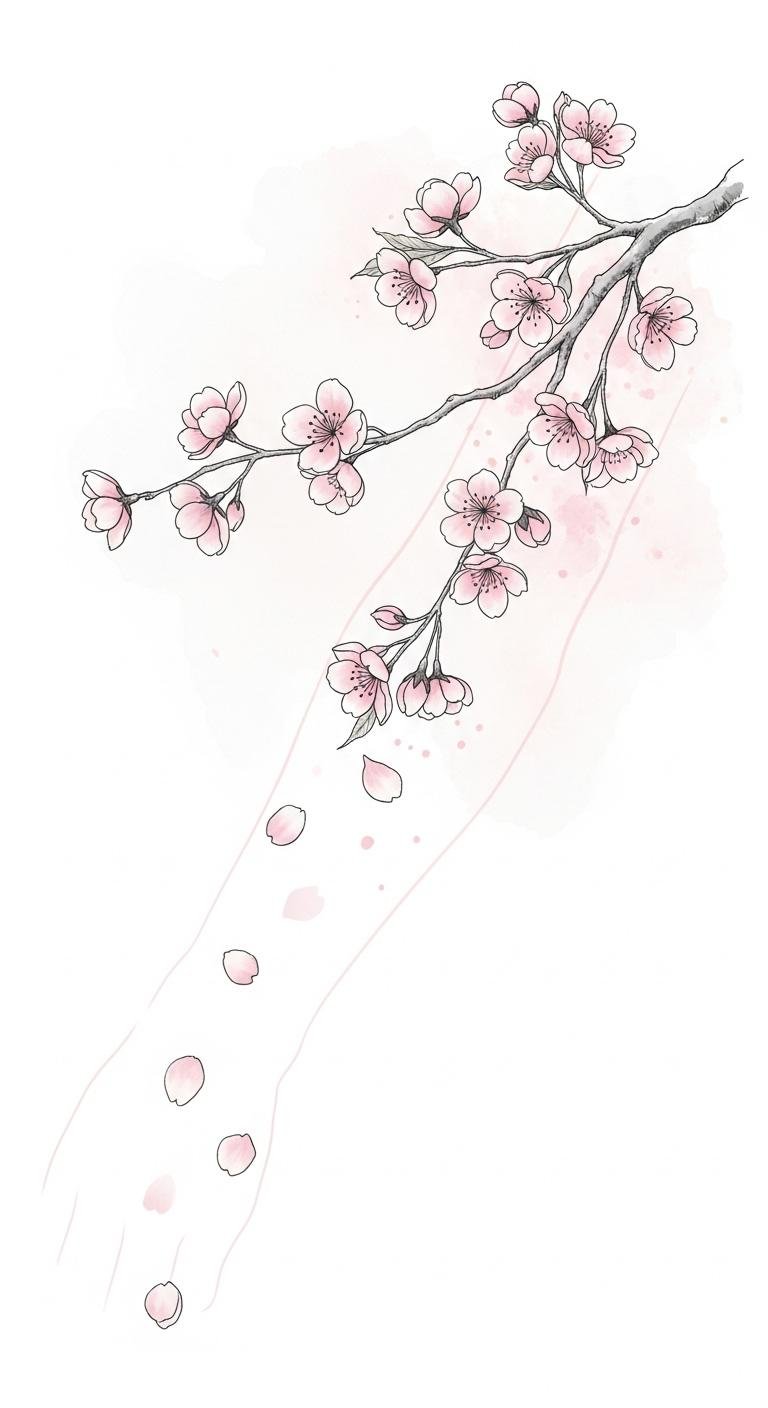 Consider placing the tattoo along the upper back or ribcage where the arching branches can follow natural contours; the watercolor effect evokes gentle emotion while drifting petals suggest movement and impermanence, making it a contemplative piece for those reflecting on change and memory.