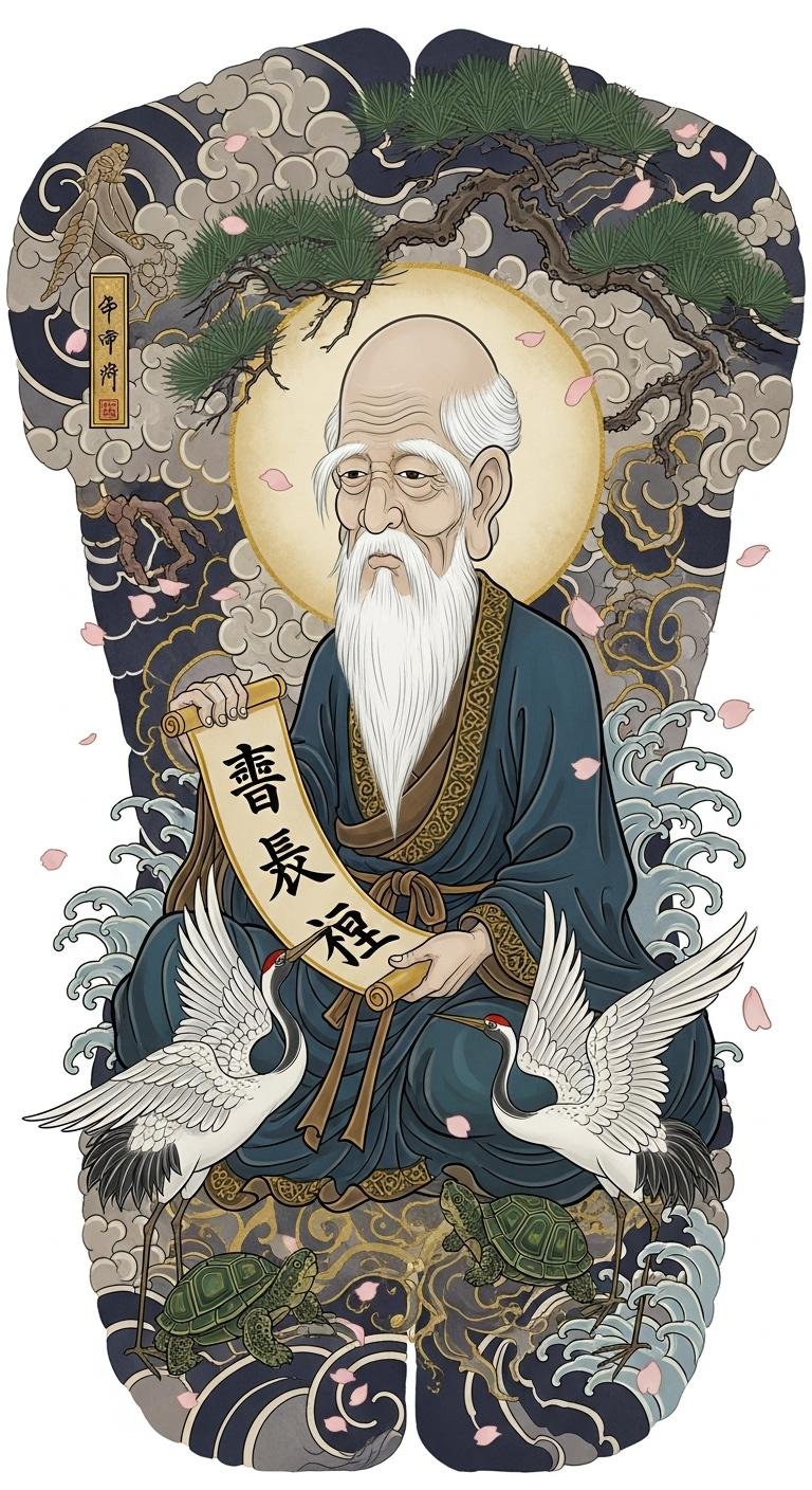 Fukurokuju tattoos embody the essence of wisdom and longevity, drawing inspiration from one of the Seven Lucky Gods in Japanese folklore. With rich fukurokuju symbolism, these tattoos represent wisdom and longevity significance through intricate design elements. Their historical context and traditional meanings resonate culturally, while modern adaptations offer unique artistic interpretations, creating spiritual connections that inspire freedom and personal expression in your ink choices. Place this design along the spine or full back to emphasize the verticality of Fukurokuju’s form, evoking serenity and reverence; the cranes and turtles at lower panels symbolize longevity grounding, while the scroll and pine guide the viewer’s eye upward, creating a contemplative emotional tone of resilience and inner peace.