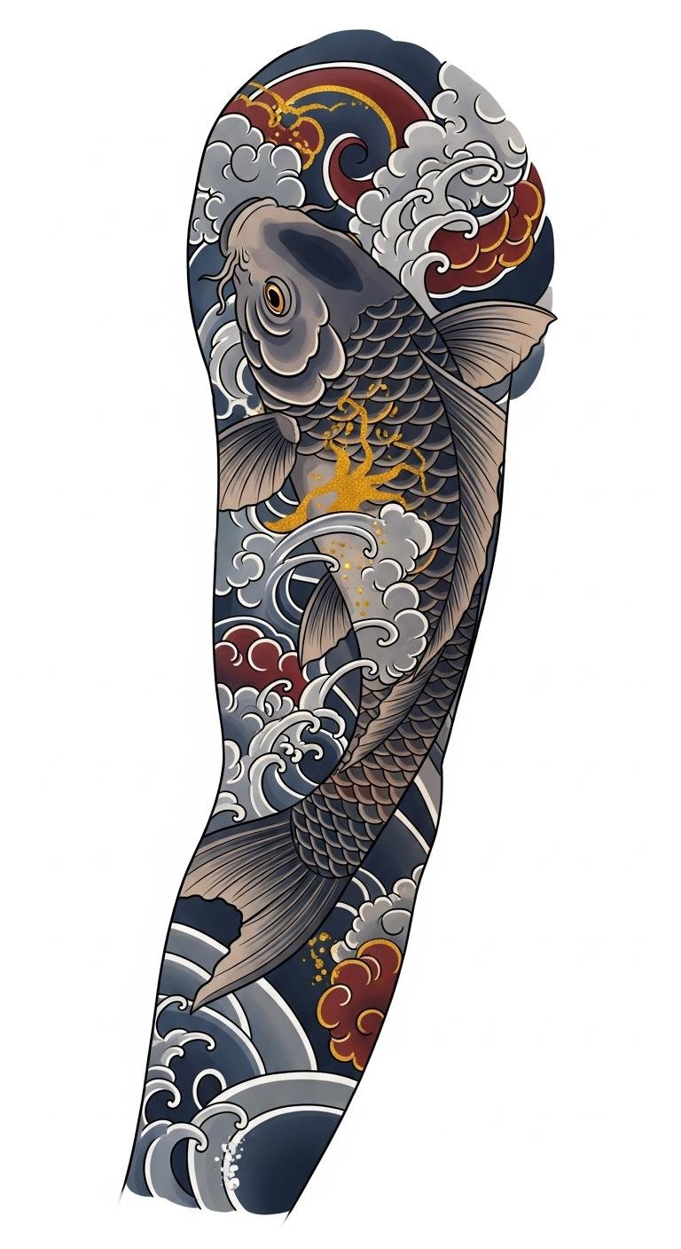 The design symbolizes perseverance (koi), transformation (fragmenting cherry blossoms), and protective strength (dragon), balancing reverence for tradition with personal modern identity; emotionally it evokes resilience and continuity, ideal for a full-sleeve placement that flows from shoulder (dragon coil) to wrist (koi and geometric waves), allowing movement with musculature and visibility for storytelling.